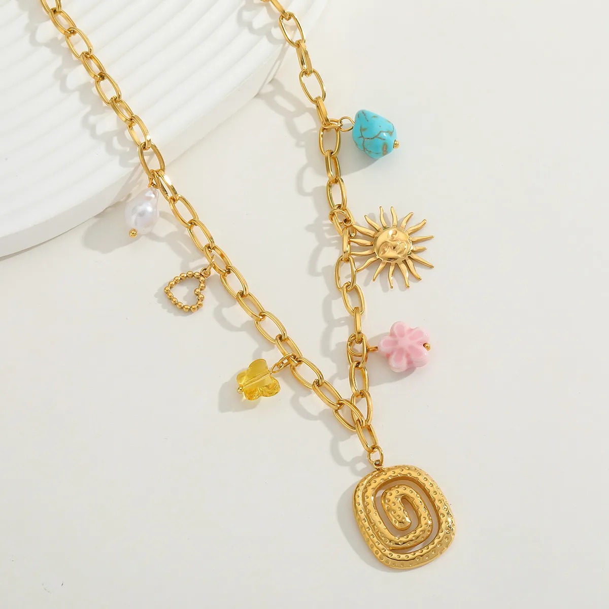 Un diseño atrevido y elegante que mezcla símbolos como el sol, la cruz y formas geométricas, todo bañado en oro de 18K con detalles de perlas de imitación. Perfecto para destacar en vacaciones, fiestas o una salida casual con estilo. Fabricado en acero inoxidable 304 de alta calidad, es una pieza resistente, sofisticada y llena de brillo. ¡Un accesorio que no pasa desapercibido!