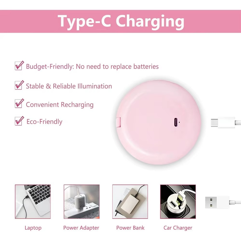 Espejo compacto de maquillaje con luz LED regulable y doble cara (1X y aumento 10X), ideal para retocar tu look en cualquier lugar. Su tamaño portátil y diseño plegable lo hacen perfecto para bolsa, mochila o bolsillo. Maquíllate con precisión incluso en ambientes con poca luz.